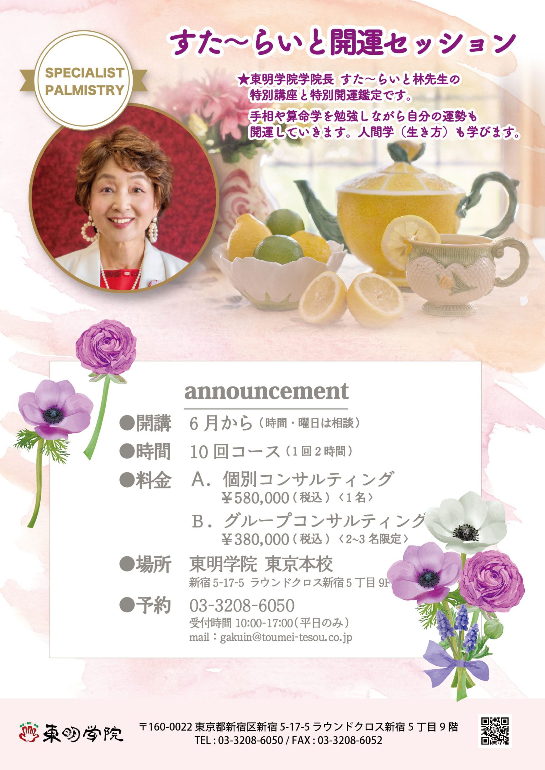 東明学院東京本校にて、学院長すた~らいと林先生の個別コンサルティング(10回コース限定)「開運セッション」が始まりました。